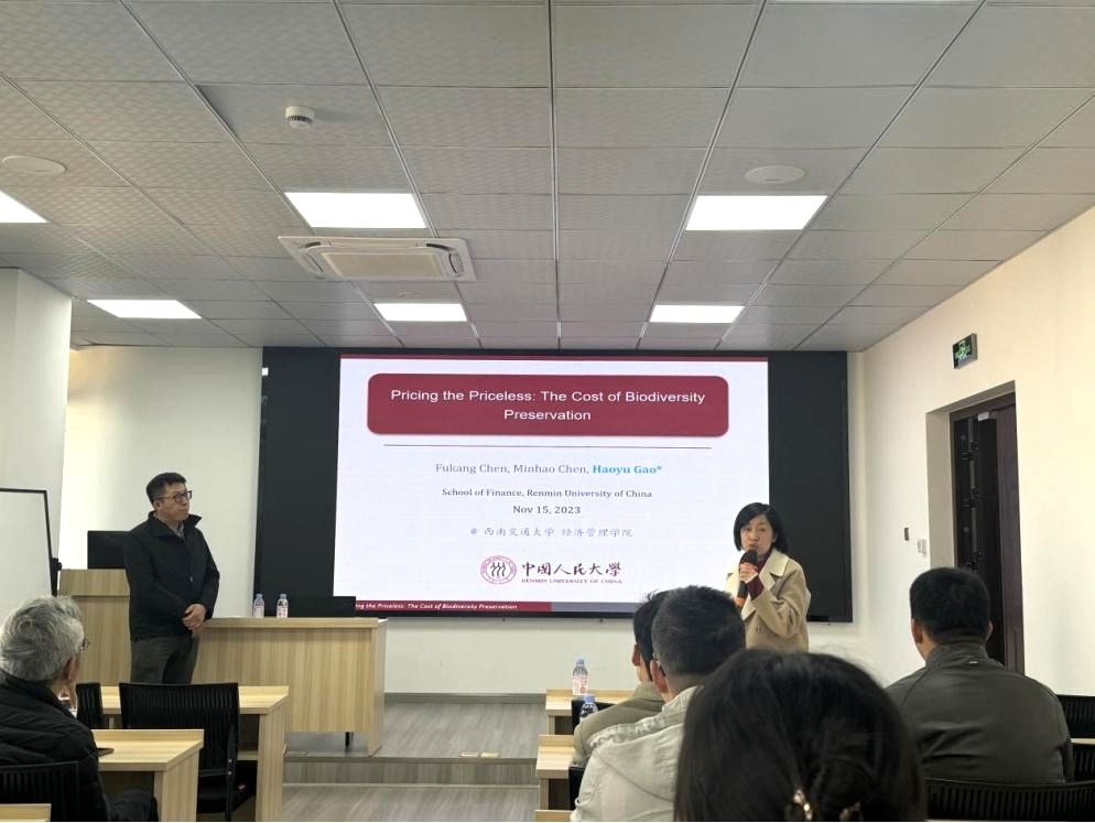 2023年11月15日下午14:00,中国人民大学财政金融学院高昊宇教授应邀在九里校区零号楼0819室为永利集团官网师生作题为“Pricing the Priceless: The Cost of Biodiversity Preservation”的学术讲座。此次讲座由学院副院长周嘉南教授主持,学院部分教师及研究生参加此次活动,周嘉南教授首先对高昊宇教授的学术成果进行了介绍,同时对高昊宇教授的到来表示热烈的欢迎与感谢。