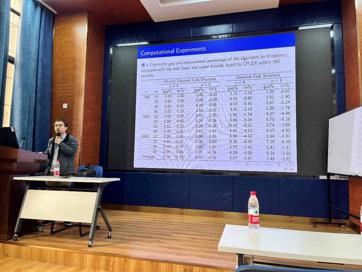 李锋教授对本研究的模型部分进行了重点讲解。其主要分为两个部分:单阶段和多阶段。就单阶段模型而言,其分别介绍了FDFD和SFDFD两个模型的构建和求解过程。就多阶段而言,其分别介绍了FDFD-NW和CFDFD-NW两个模型的构建和求解过程,并分享了其在这一部分求解过程中遇到的计算上的难题及解决办法。此外,其还介绍了模型的算例实验部分,并介绍了其中某一结果不佳时的解决办法。最后李教授表示,做科研的过程中要享受科研的乐趣、耐得住寂寞并放平心态。