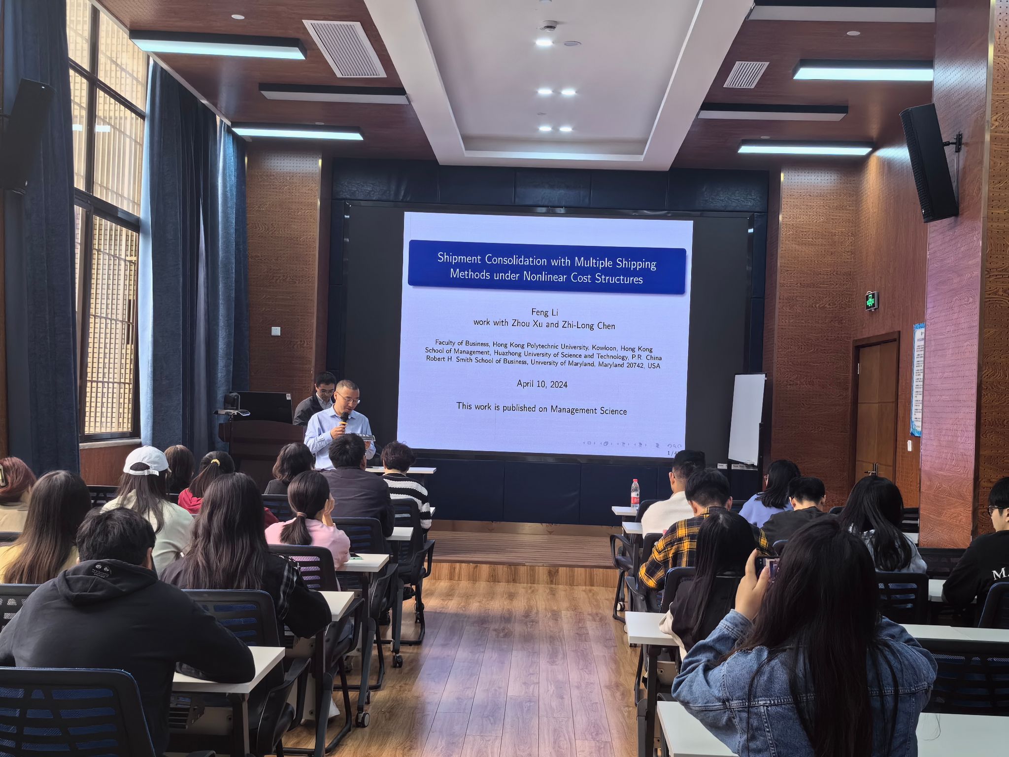 2024年4月10日,华中科技大学李锋教授应邀在402永利集团官网入口为学院报师生分享题为“基于非线性费用函数下多运输模式的订单匹配问题”的学术讲座。本次学术活动由学院副院长聂佳佳教授主持,学院部分教师及研究生参加了此次学术活动。