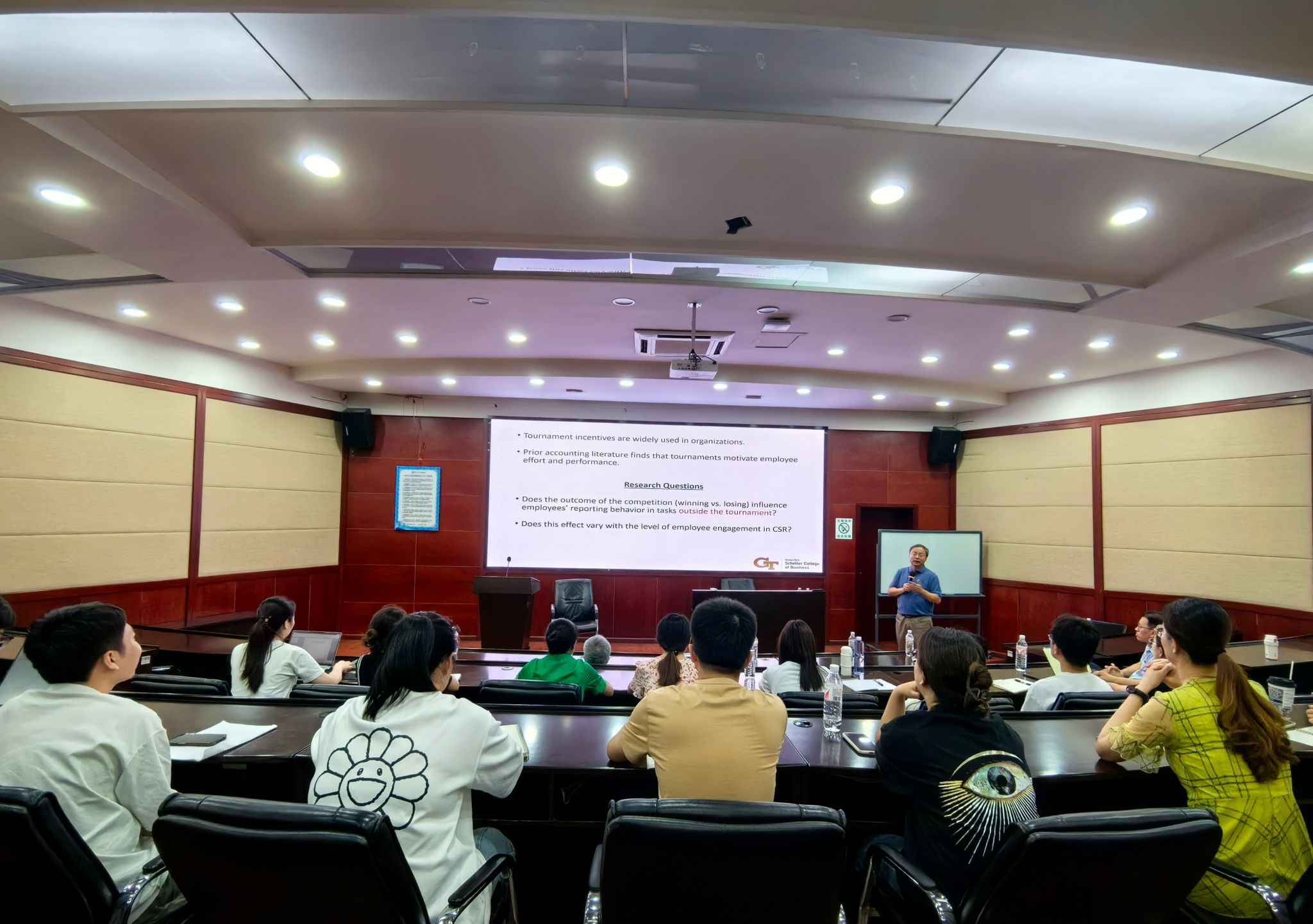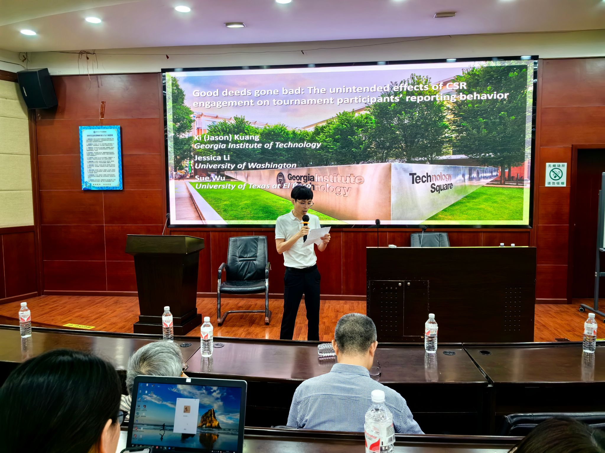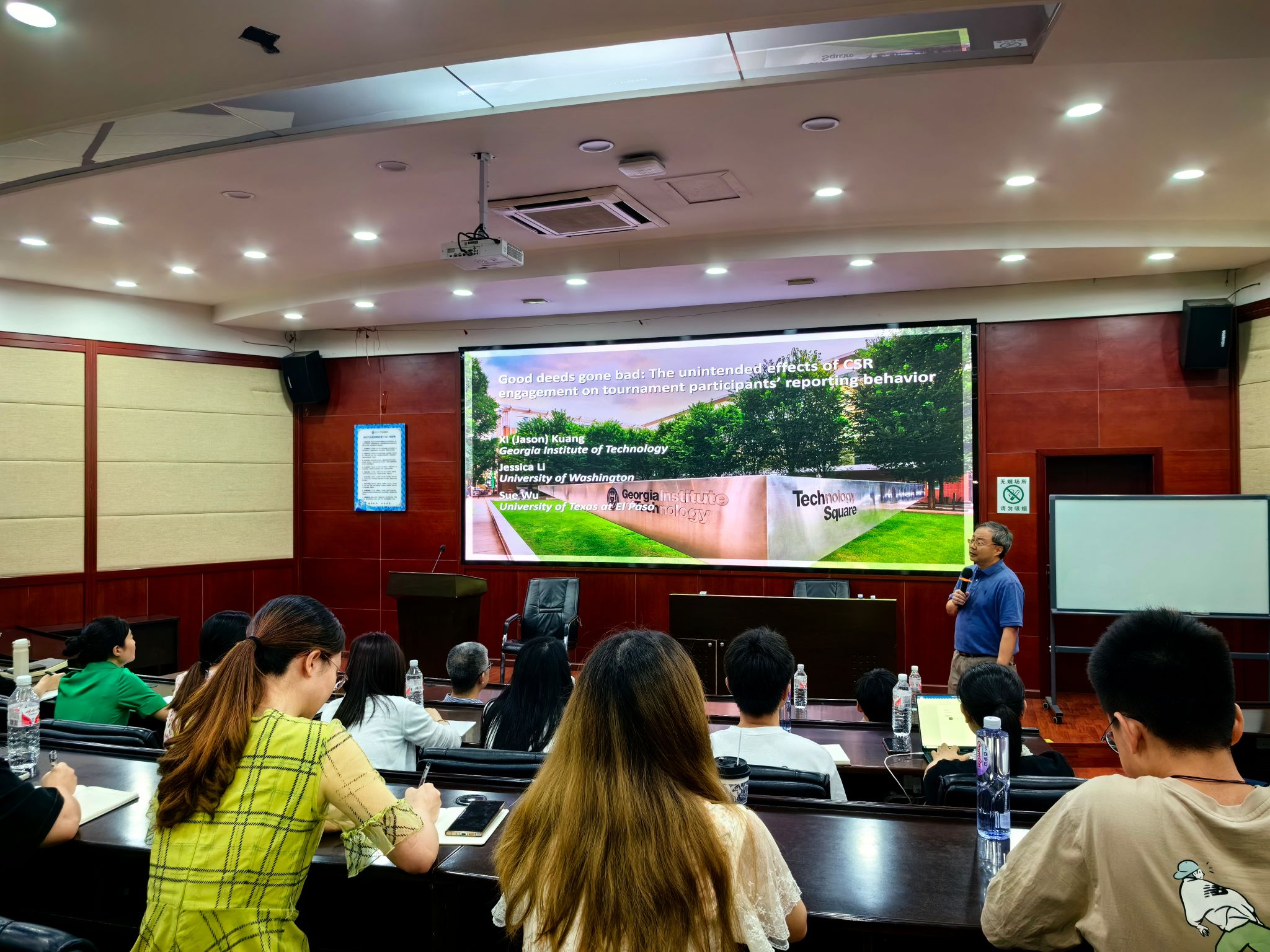 2024年6月28日下午,美国佐治亚理工学院况熙教授应邀在402永利集团官网入口开展题为“Good deeds gone bad: The unintended effects of CSR engagement on tournament participants’ reporting behavior”的学术报告,副院长马锋主持了此次学术讲座,学院部分教师及研究生参加了此次活动。副院长马锋介绍了况熙教授的学术背景及研究成果,并对况熙教授的到来表示热烈的欢迎和诚挚的感谢。