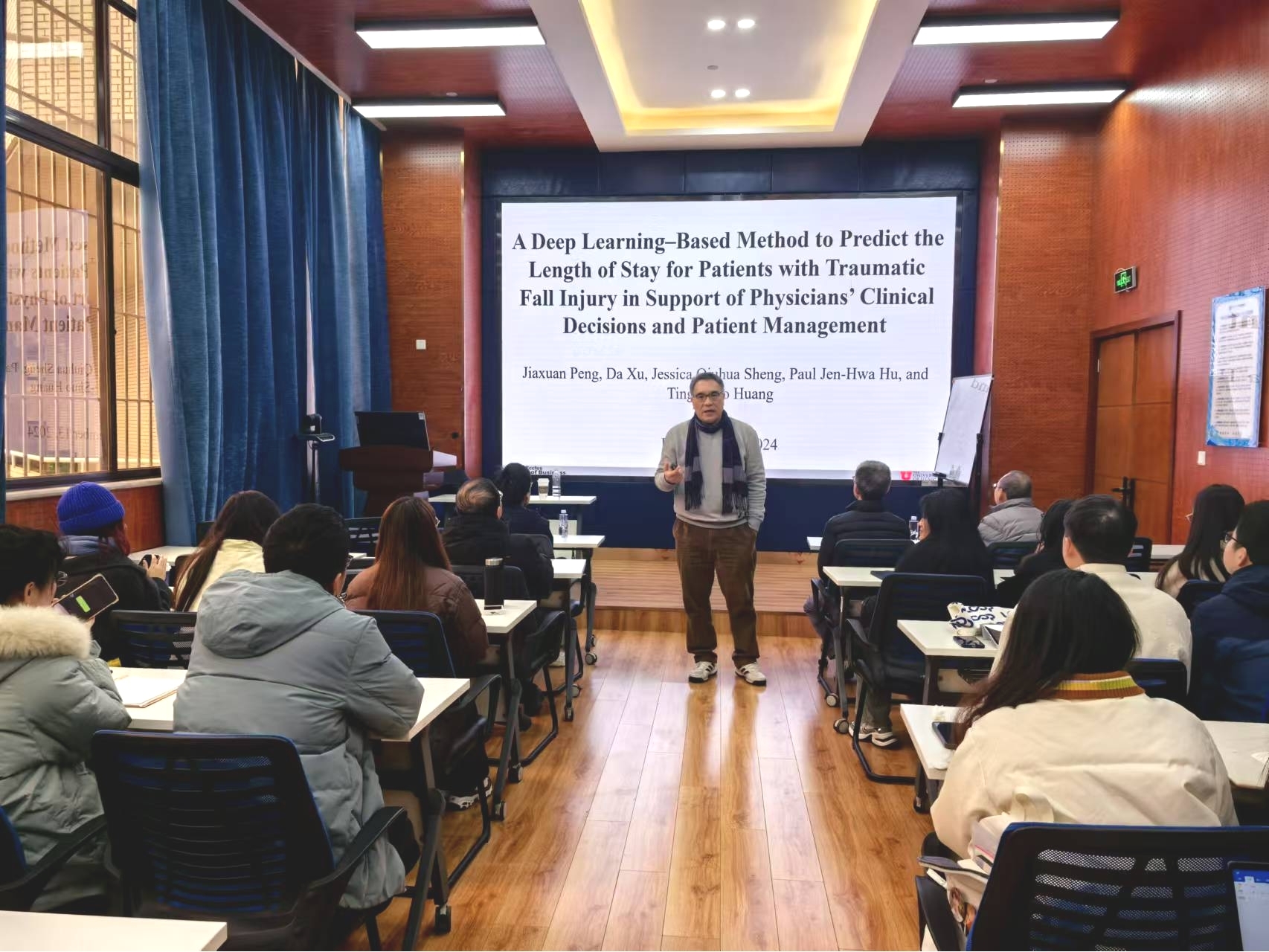 2024年12月13日上午,犹他大学胡仁华教授应邀为永利集团官网师生带来一场题为“A Deep Learning–Based Method to Predict the Length of Stay for Patients with Traumatic Fall Injuries in Support of Physicians’ Clinical Decisions and Patient Management”的学术讲座。本次学术活动由学院副院长马锋教授主持,学院部分教师及研究生40余人参加此次学术活动。副院长马锋介绍了胡仁华教授的学术背景与成就,并对胡教授的到来表示热烈欢迎。