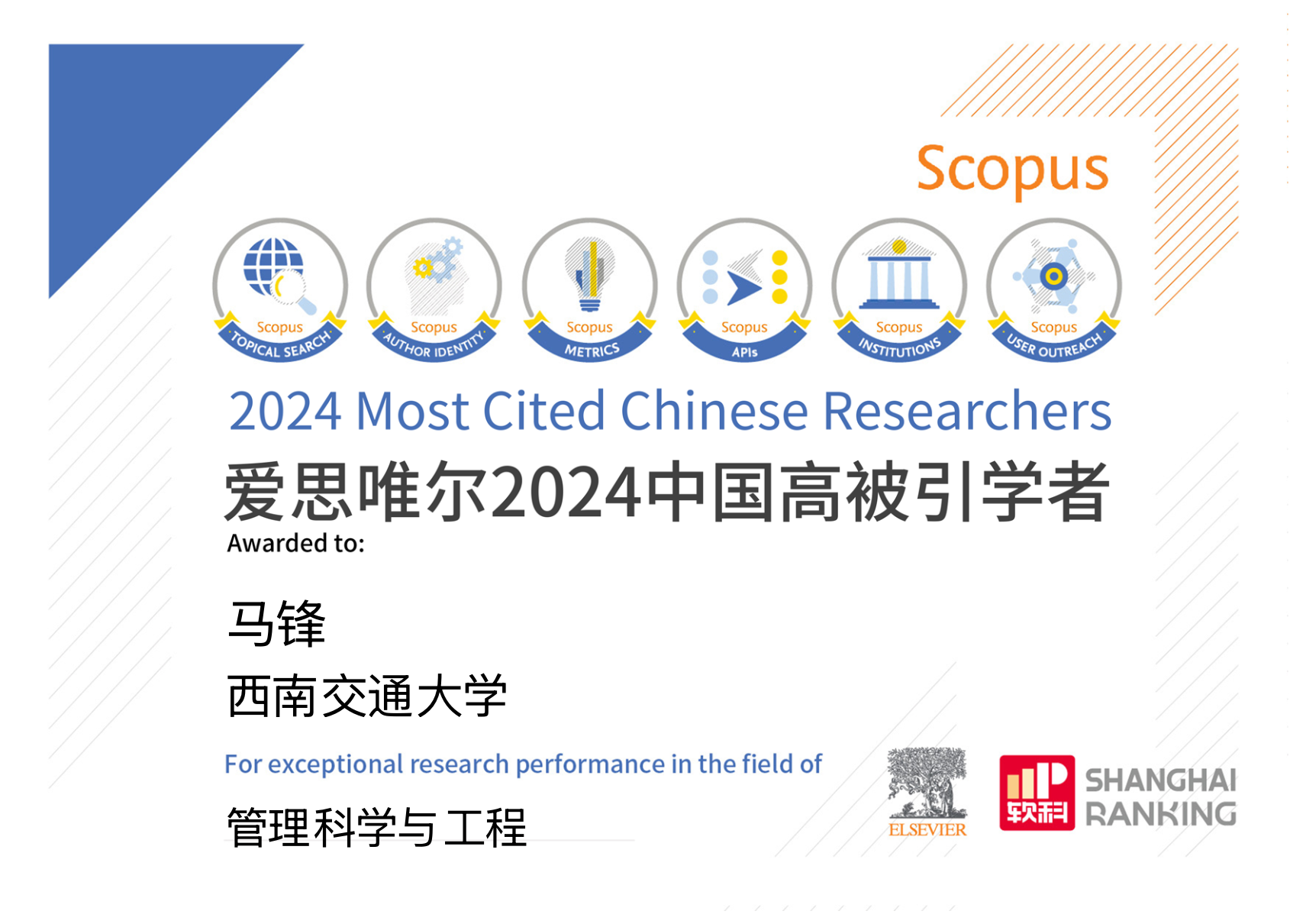2025年3月25日,爱思唯尔(Elsevier) 重磅发布2024中国高被引学者 (Highly Cited Chinese Researchers)榜单。402永利集团官网入口马锋教授和梁超副教授入选管理科学与工程领域中国高被引学者。这是马锋教授连续第五年、梁超副教授首次入选该榜单。