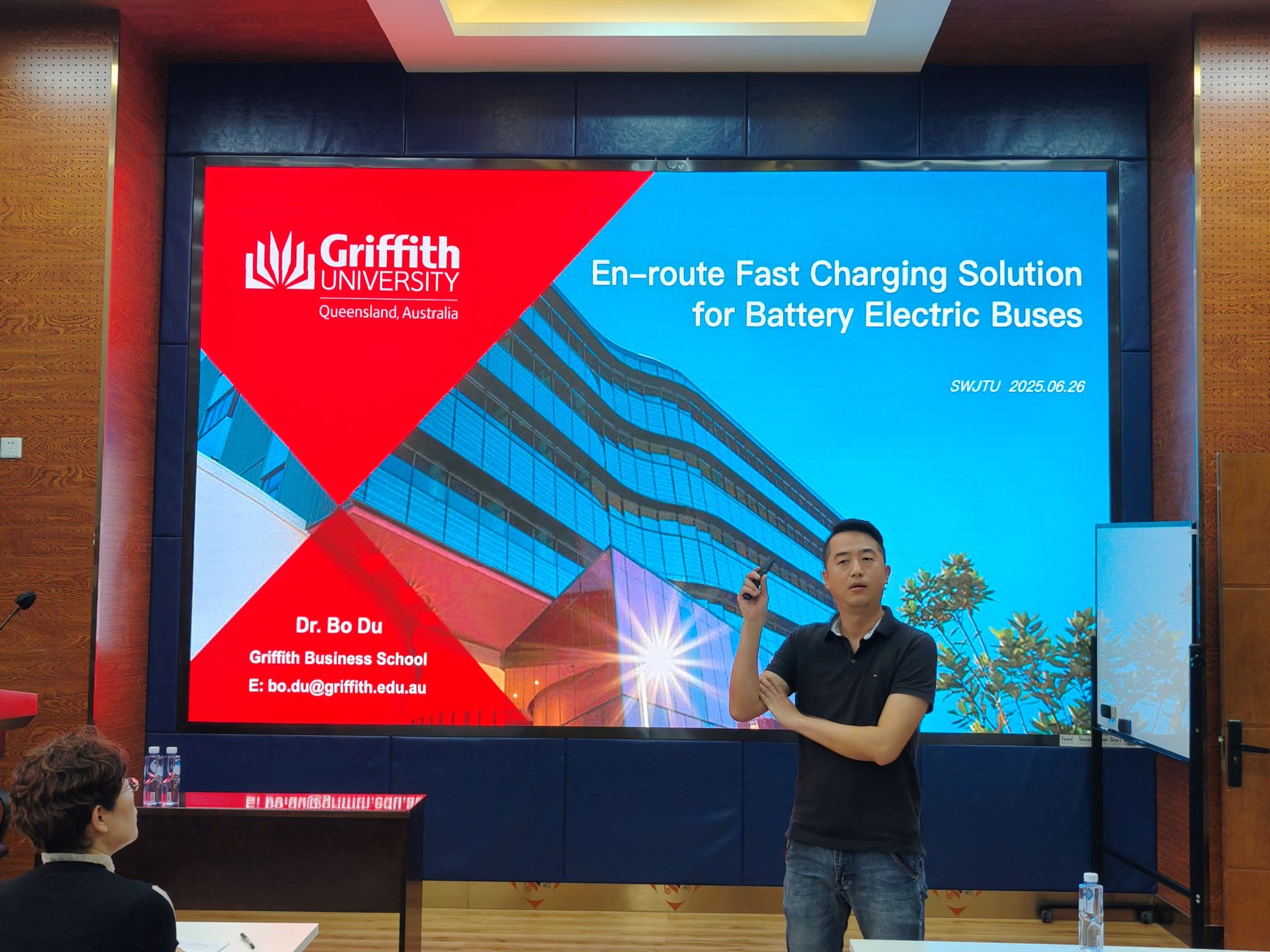 2025年6月26日上午,澳大利亚格里菲斯商学院杜波老师应邀为永利集团官网师生带来一场题为“En-route Fast Charging Solution for Battery Electric Buses”的学术讲座。本次讲座由402永利集团官网入口信息系统与运营管理系陈彦如教授主持,学院部分师生参加了此次活动。陈彦如教授首先介绍了杜波老师的学术背景,并代表学院对杜波老师的到来表示热烈欢迎与诚挚感谢。