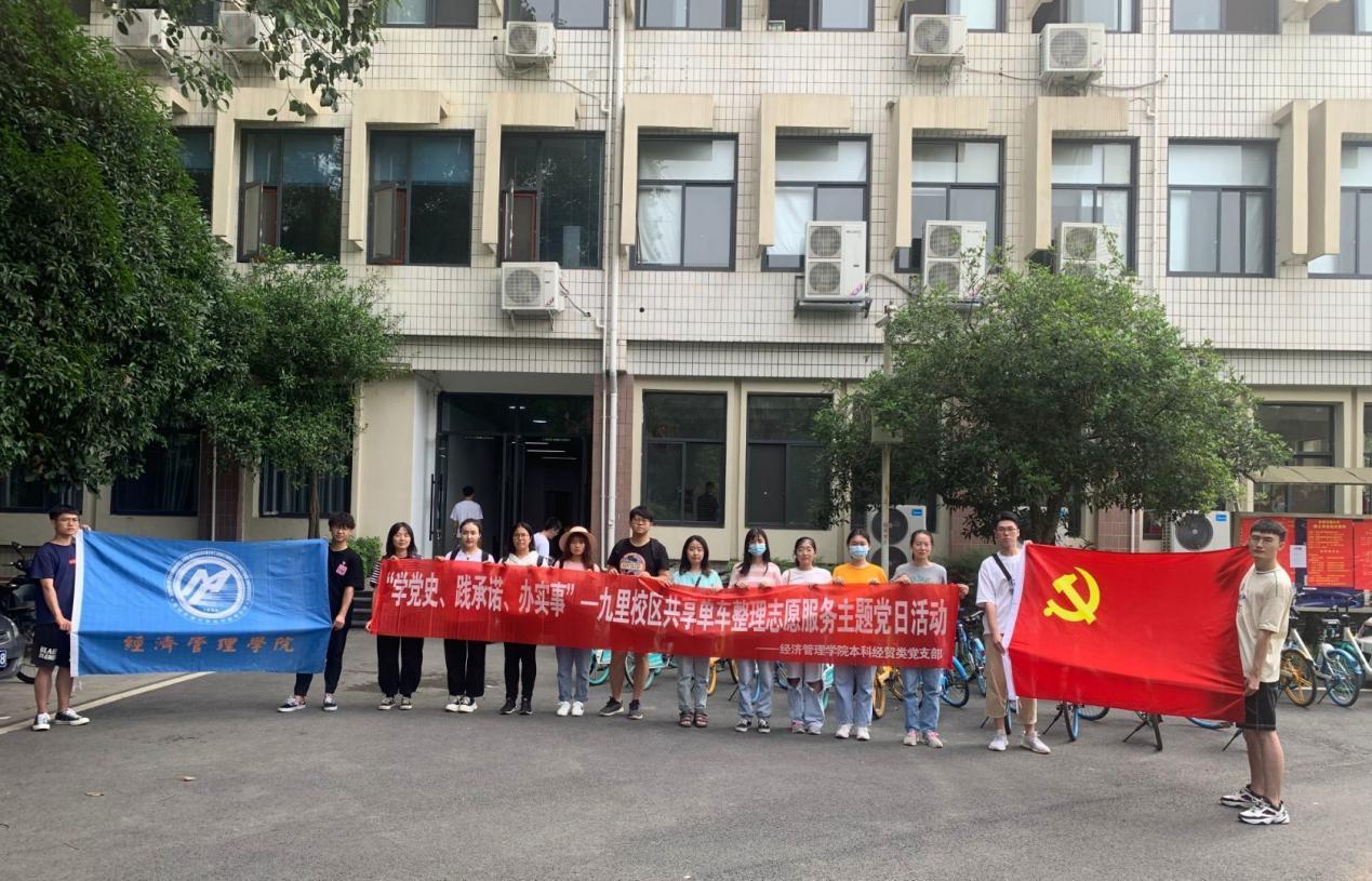 共享单车为人们的出行带来了极大的便利,但同时共享单车乱停乱放的现象也随之出现。为此,402永利集团官网入口本科经贸类党支部在5月27日下午举办了以“学党史、践承诺、办实事”为主题的九里校区共享单车整理志愿服务主题党日活动。