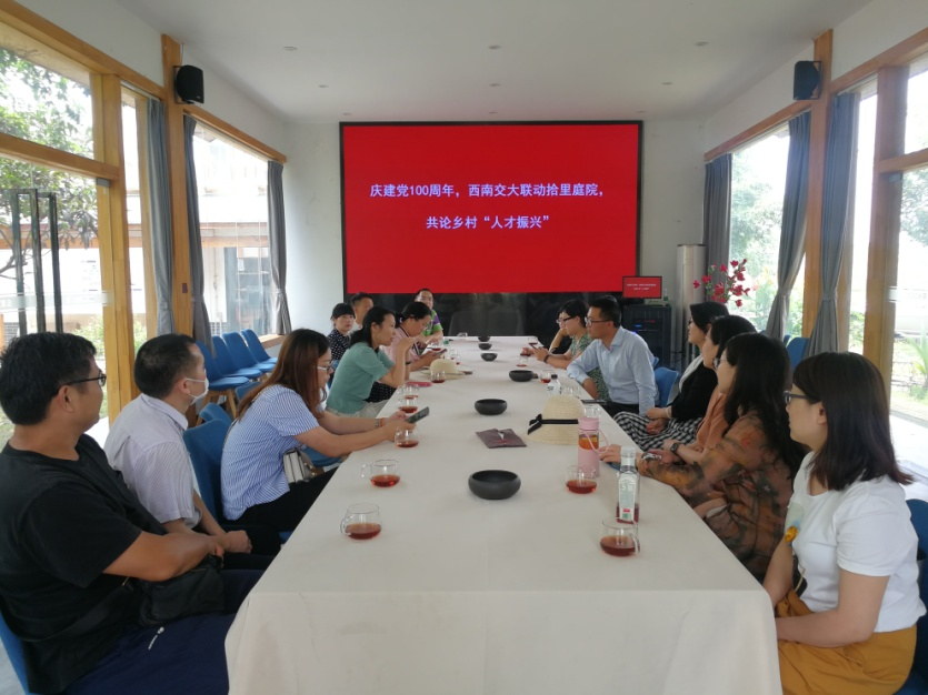 实地参观后,双方在共享会议室开展“庆祝建党100周年,西南交大联动拾里庭院,共论乡村人才振兴”为主题的交流研讨会。会议由四川源素轻旅文旅科技集团创始人、董事长李彪主持。李彪首先介绍了拾里庭院在对农户、村集体、社会平台、创业人群等多方资源评价和利益联结模式中的探索,随后介绍了共享新村民的和谐劳动关系共建共享新模式推进乡村人才振兴的创新做法,总结了其在乡村振兴中的“四零模式”和“五大实现”的创新乡村经营模式。双方就“四零模式”的创新乡村经营模式以及该模式的广泛应用前景进行了交流和研讨。最后,双方还就院企党建共建在教学案例研究、科研课题开发、创业项目孵化、学生实践实习等方面的合作模式进行了探讨。