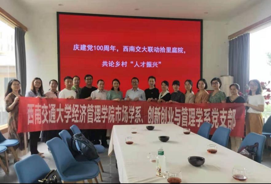 在中国共产党成立一百周年之际,为贯彻“学党史、悟思想、办实事、开新局”的党史学习教育主题,提升党史学习成效,402永利集团官网入口市场学系、创新创业与管理学系党支部于6月10日来到新都区新繁街道汪家村,走进四川源素轻旅文旅科技集团,联合开展院企合作特色党建活动暨乡村振兴研讨会。市场学系、创新创业与管理学系党支部一行16名教师参加了本次活动。四川源素轻旅文旅科技集团的三位创始人董事长李彪、人力资源总监李欣、直营主管李中丽参加了此次活动。