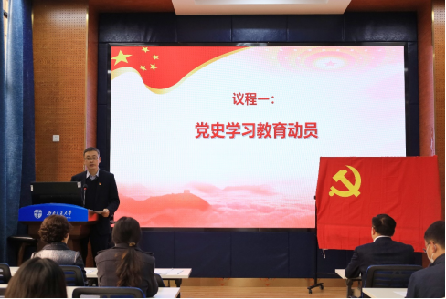 王斌同志强调全院师生尤其是全体党员要以习近平新时代中国特色社会主义思想为指导,学以觉悟,提高政治站位,深刻领会党史学习教育的重大意义,深刻领悟“为什学”,“学什么”以及“怎么学”,把思想和行动统一到党中央的决策部署上来;要根据党中央和学校党委的要求,结合学院实际,扎实把党史学习教育组织好、开展好,确保取得实实在在的成效。