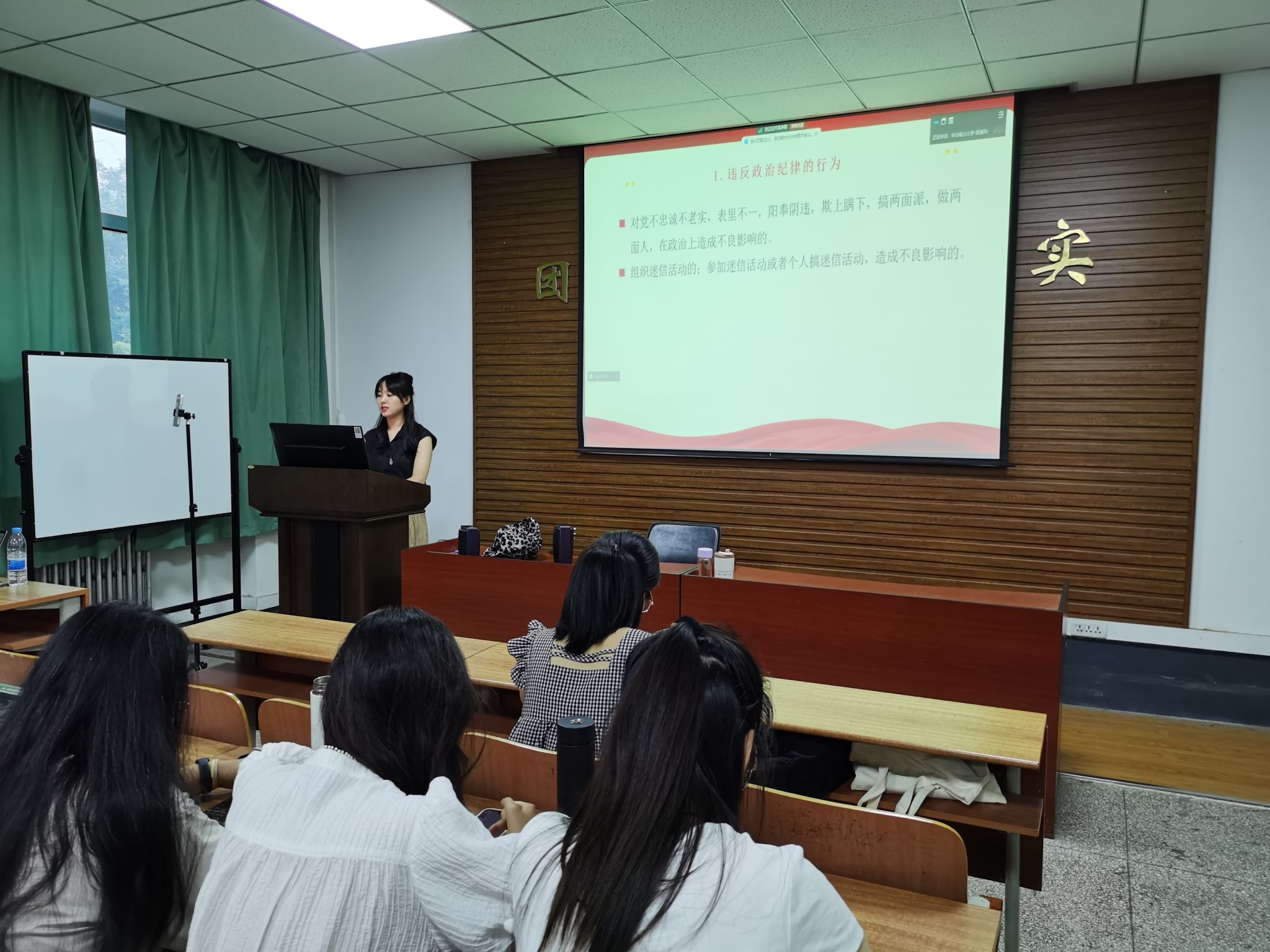 永利集团官网硕士2023级第二党支部青年委员张志辉领学《中国共产党纪律处分条例》的学习内容,对于条例的主要修订内容进行了展示和分析,对新增条款、处理方式和应用场景的规范进行了讲解,加深了党员同志对党纪党规的理解和认识。