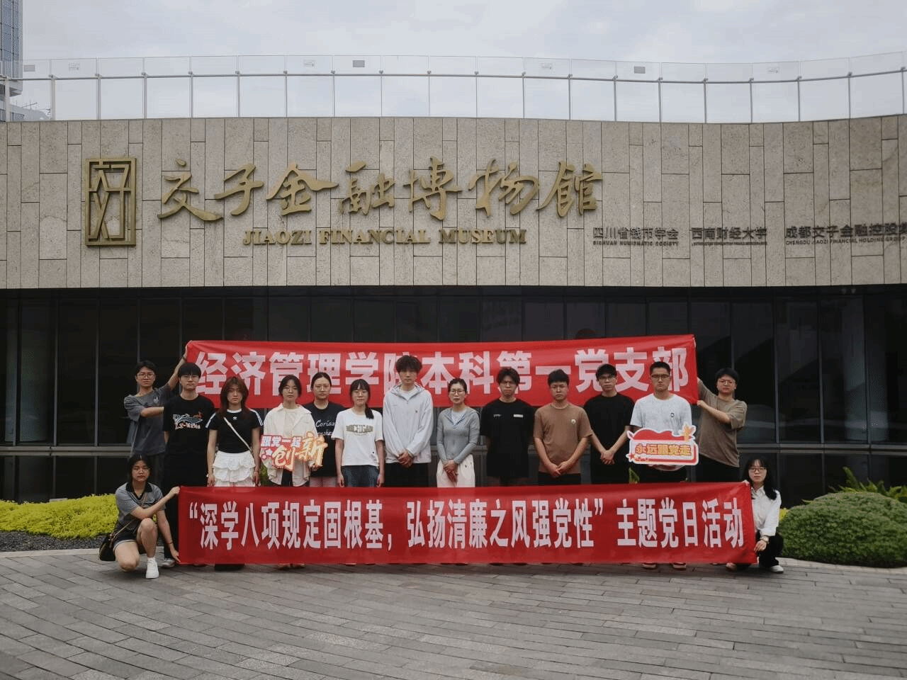 为深入贯彻中央八项规定精神学习教育,强化党员队伍作风建设,筑牢党员思想防线,增强党性修养,弘扬清廉之风。2025年5月15日下午,402永利集团官网入口本科第一党支部赴成都交子金融博物馆开展“深学八项规定固根基,弘扬清廉之风强党性”主题党日活动,将交子红色货币金融文化与党员廉洁教育、作风建设深度融合,为支部青年党员打造了一堂“行走的思政课”。