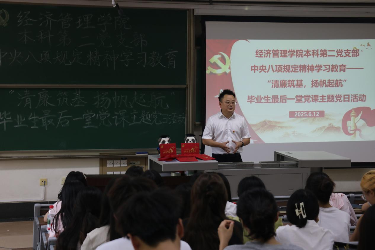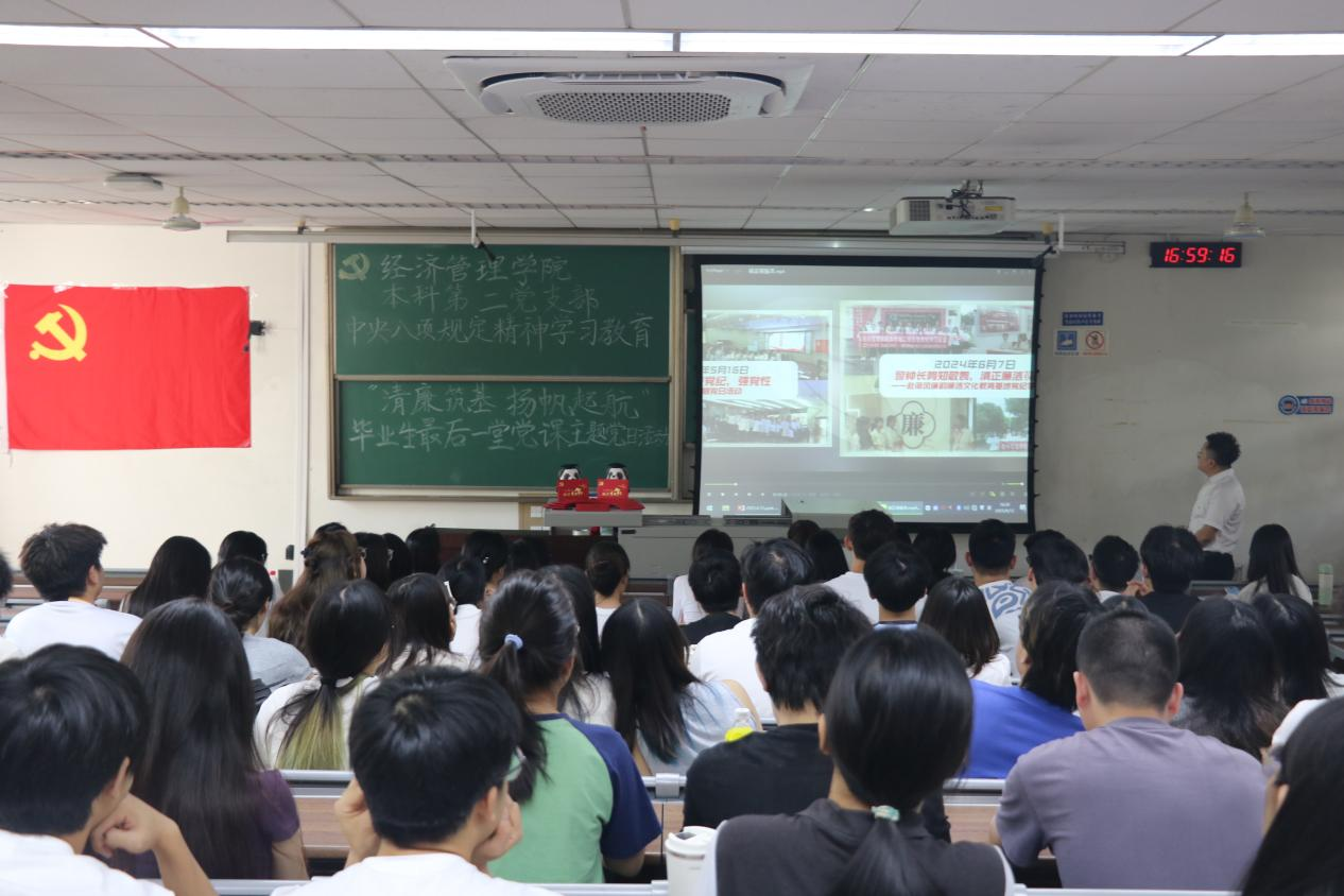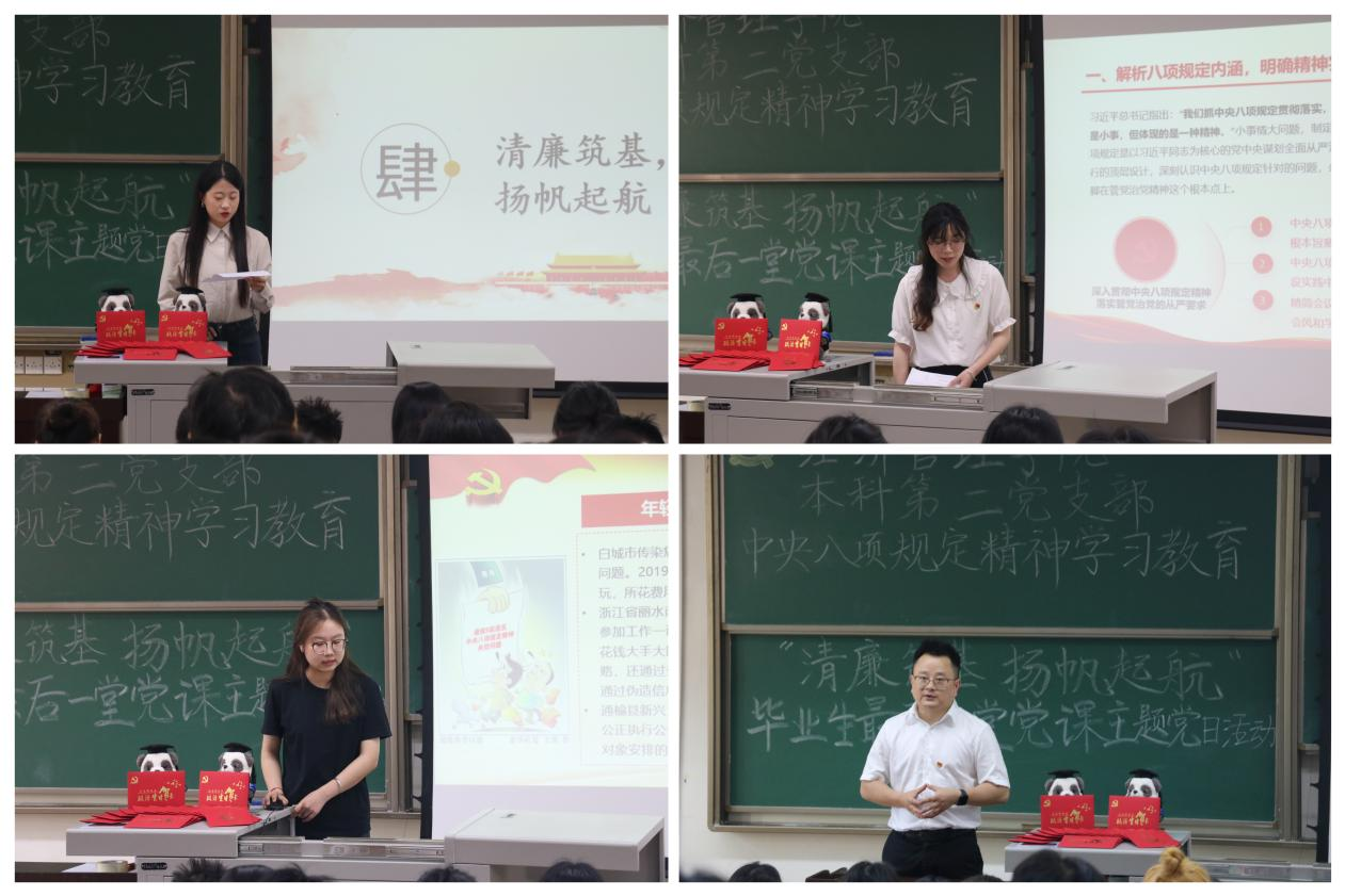 为深入贯彻中央八项规定精神学习教育,强化党员的廉洁自律意识,进一步增强毕业生党员的党性意识和社会责任感,6月12日,402永利集团官网入口本科第二党支部于J4310开展深入贯彻中央八项规定精神学习教育——“清廉筑基、扬帆起航”毕业生最后一堂党课主题党日活动。